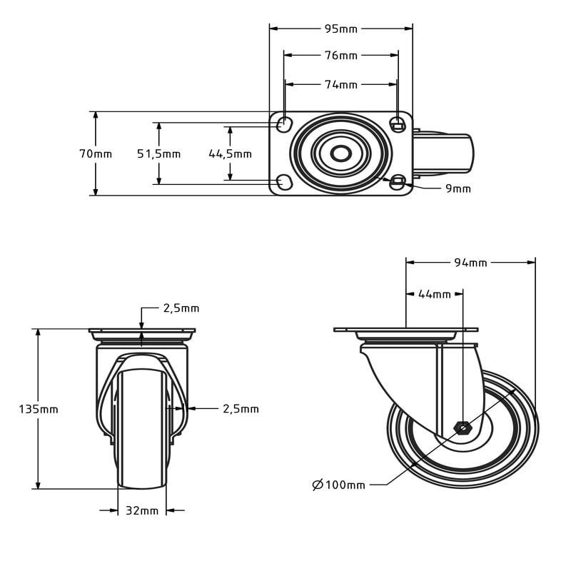 Der Gabelkopf der Lenkrolle ist mit einem Plattenbeschlag von 95x70 mm ausgestattet. Der Bolzenlochabstand beträgt 75x50 mm bei einem Befestigungsdurchmesser von Ø9 mm. Außerdem ist der Gabelkopf galvanisch verzinkt und bietet eine leichte Form von Korrosionsschutz.