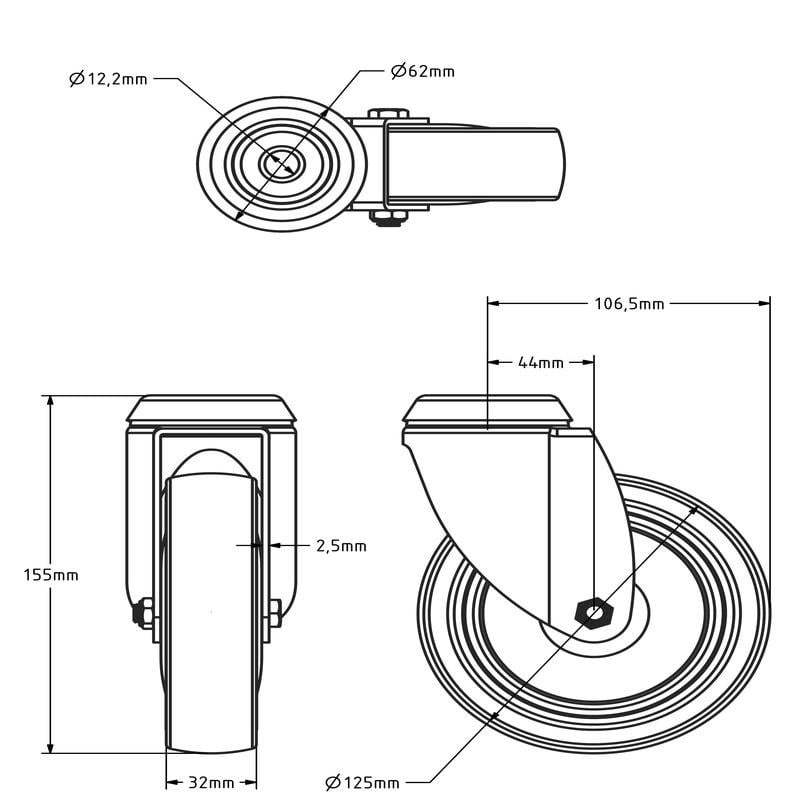 Lenkrolle 125 mm mit Kugellager und Bolzenloch - 125 kg
