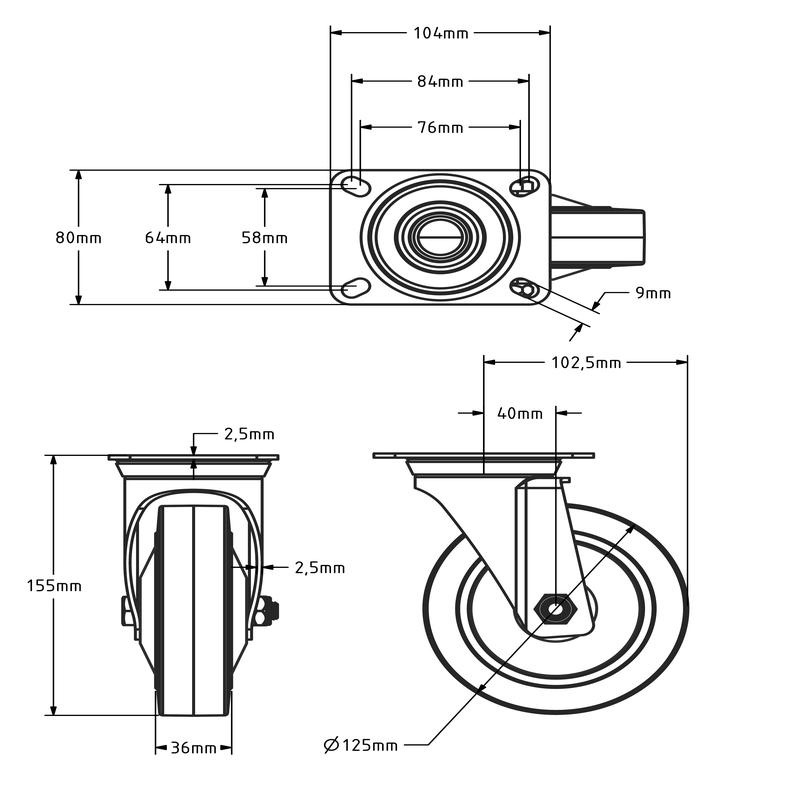 Gummilenkrolle 125 mm mit Platte - 220 kg