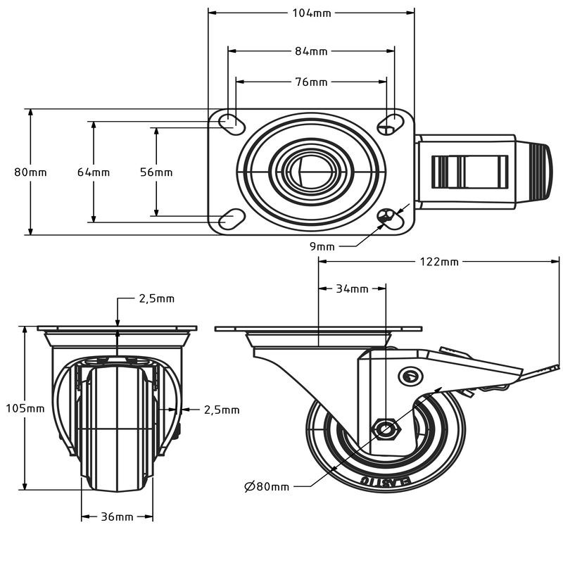 Lenkrolle mit Bremse aus Gummi 80 mm - 110 kg