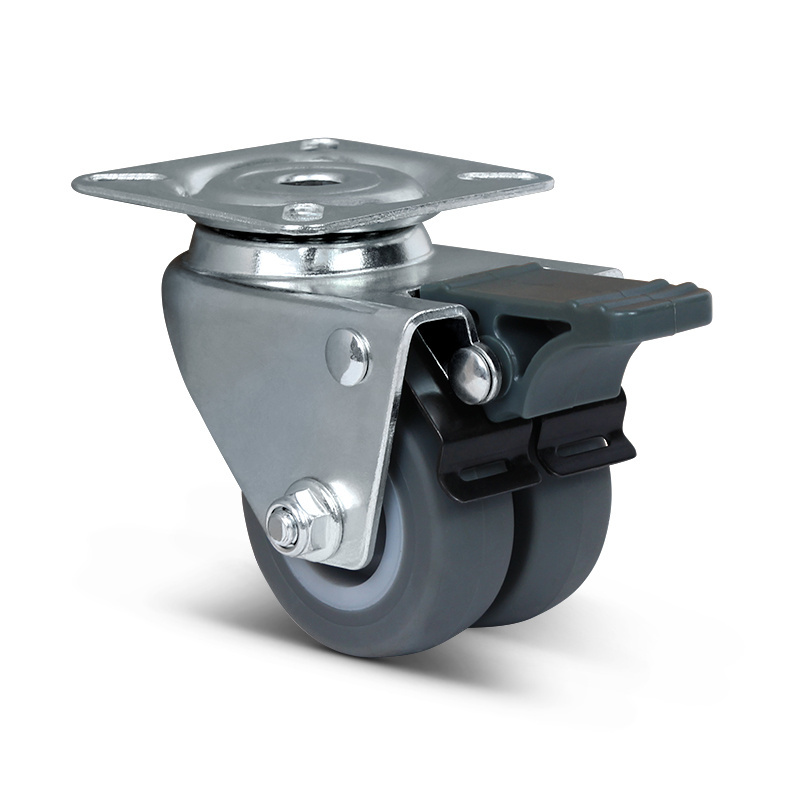 Die Doppelrollen sind mit einer Kunststoffbremse ausgestattet, die den Lenkkopf und die Lenkrollen gleichzeitig blockiert. Die Doppelrollen bieten eine höhere Tragfähigkeit als die einfache Variante. Die TPR-Lauffläche ist spurlos und sorgt für eine leichte Dämpfung auf rauhen Böden. Die Räder sind gleitgelagert und beidseitig offen: Schmutz kann eindringen, aber im Gegensatz zu Kugellagern bleiben Gleitlager bei eventuell höherem Rollwiderstand immer funktionsfähig. Die Schwenkgabel ist verzinkt, so dass leichte Feuchtigkeitsablagerungen nicht zu Rost werden.