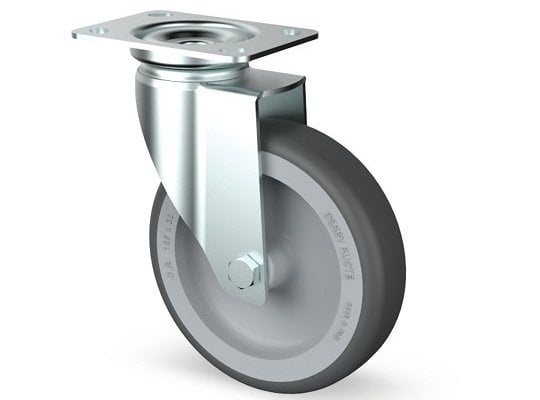 Räder mit grauemTPR-Gummireifen (ohne Markierung), eingespritzt auf eine Kunststofffelge mit Gleitlager und Achsbuchse aus Edelstahl.