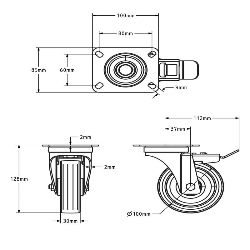 Lenkrollen mit Bremse aus Edelstahl 100 mm PU mit Edelstahlrollenlager und Platte - 150 kg