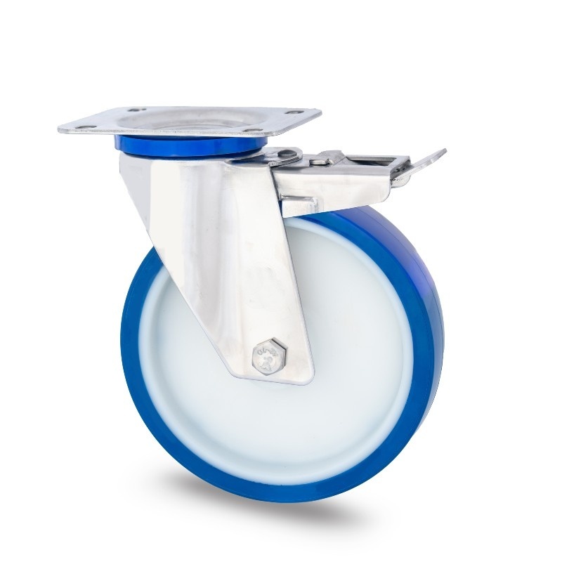 Edelstahl Lenkrollen mit Bremse 125 mm PU mit Edelstahlrollenlager und Platte - 200 kg