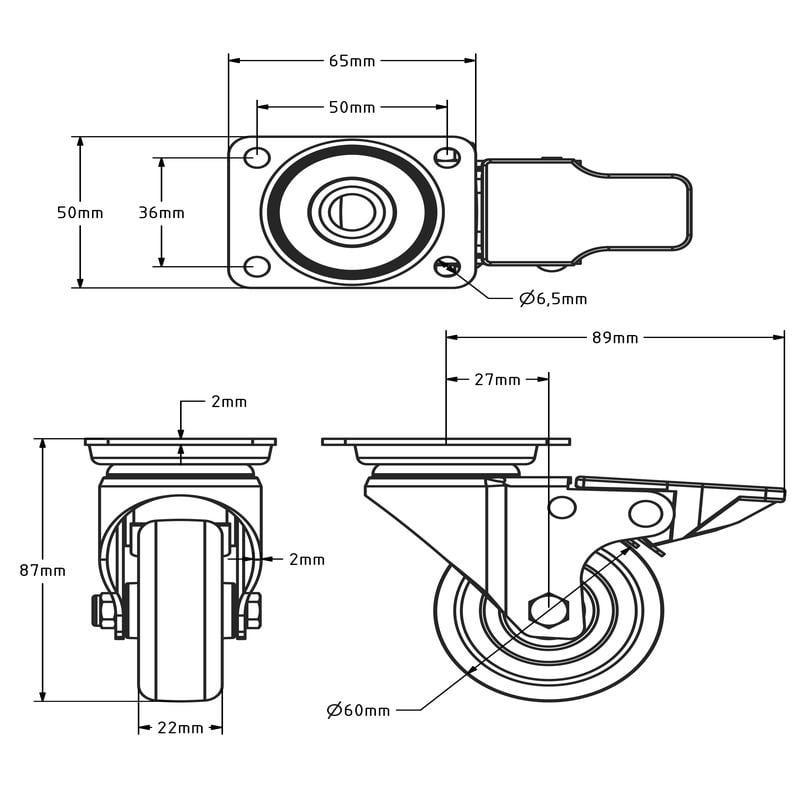 Lenkrollen mit Bremse aus Edelstahl 60 mm Gummi mit Platte - 40 kg