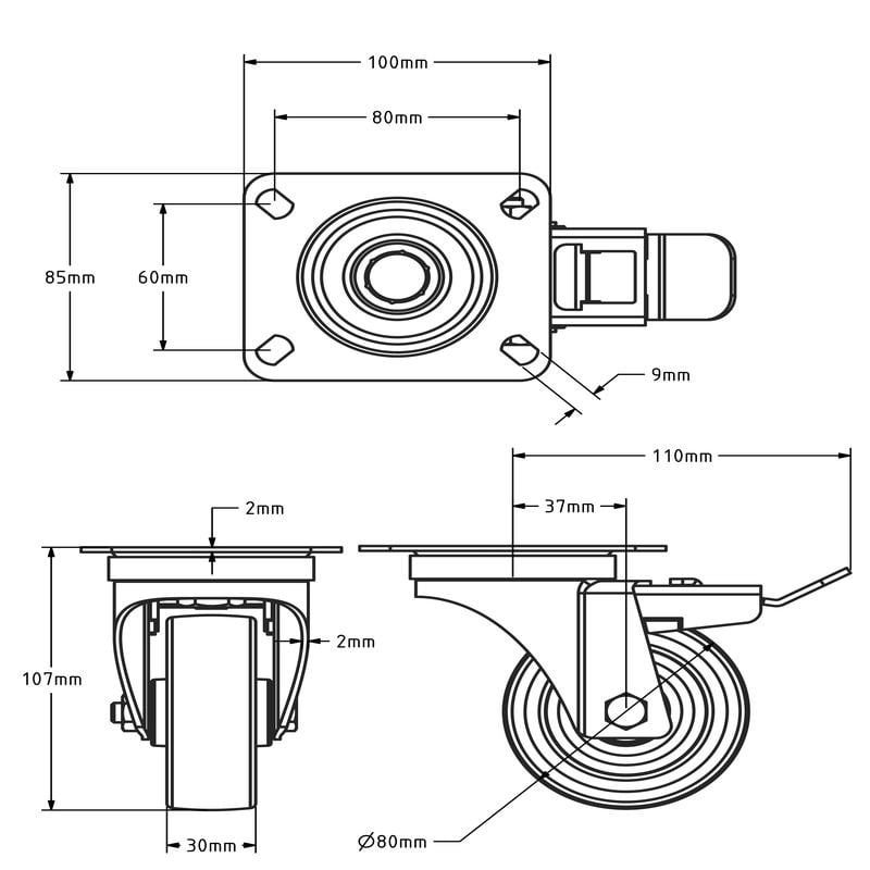 - Bolzenlochabstand: 80 x 60 - Ø 9 mm