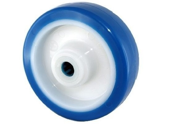 Räder mit blauem Polyurethan-Reifen (ca. 95 Shore A), aufgespritzt auf eine weiße Polyamid-Felge mit Edelstahl-/Ox-Rollenlager.