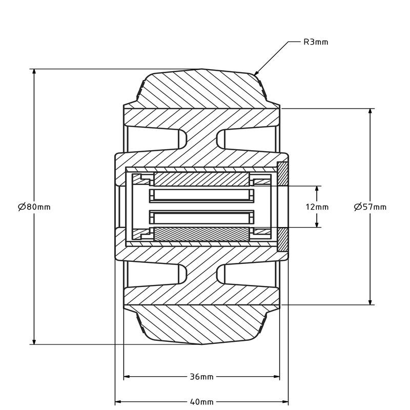 Gummirad 80 mm mit Rollenlagerbohrung 12 mm - 110 kg