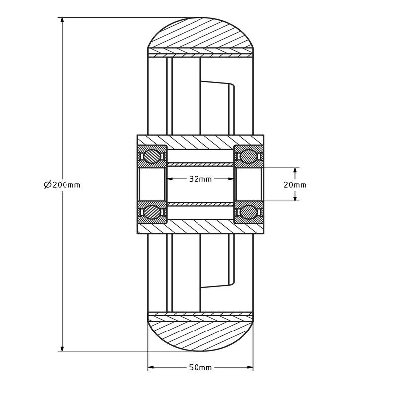 Ergonomisches Polyurethan-Rad 200 mm mit Kugellagerbohrung 20 mm - 700 kg