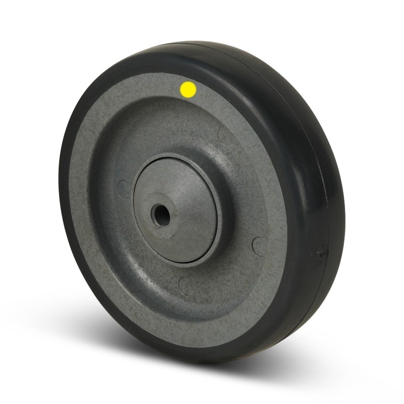 Räder mit grauem, antistatischem Polyurethan-Reifen (ca. 95 Shore A), der auf eine elektrisch leitfähige Polyamid-Felge gespritzt ist, mit einem zentrierten Kugellager aus rostfreiem Stahl/inox und Kunststoff-Radkappen.