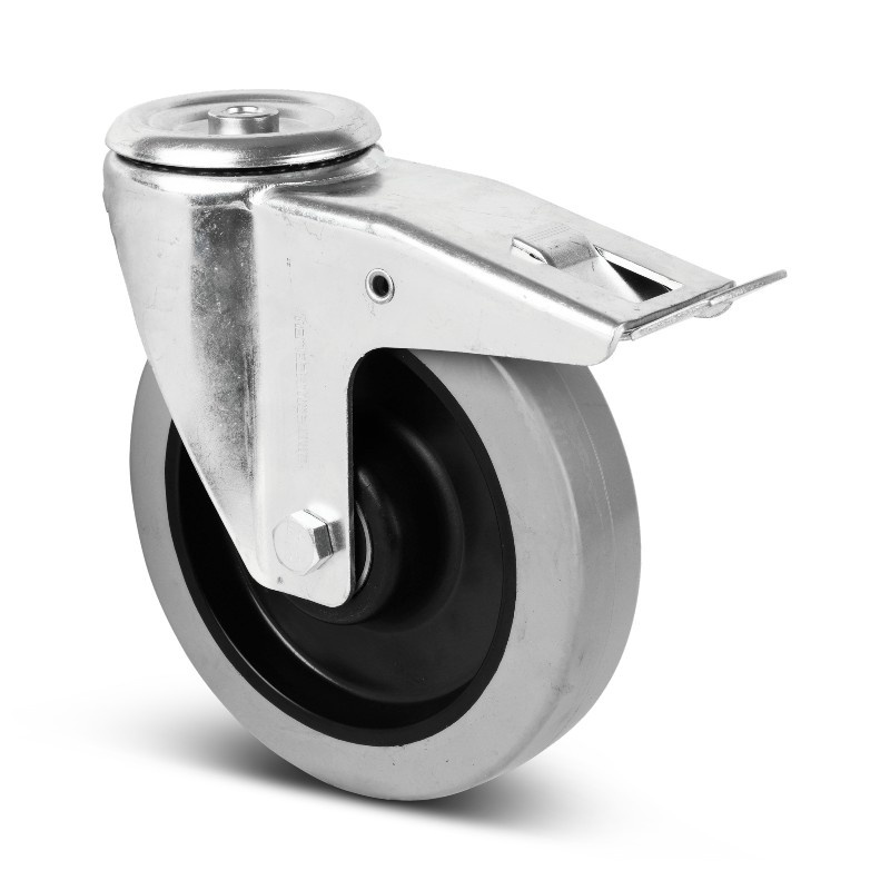 Lenkrolle mit Bremse 200 mm aus Gummi mit Bolzenlochbefestigung - 400 kg