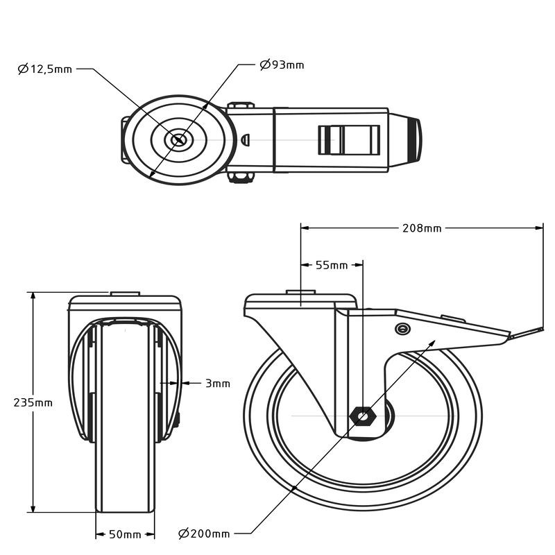 Gummilenkrolle mit Bremse 200 mm - Rückenloch - Kugellager - 400 kg