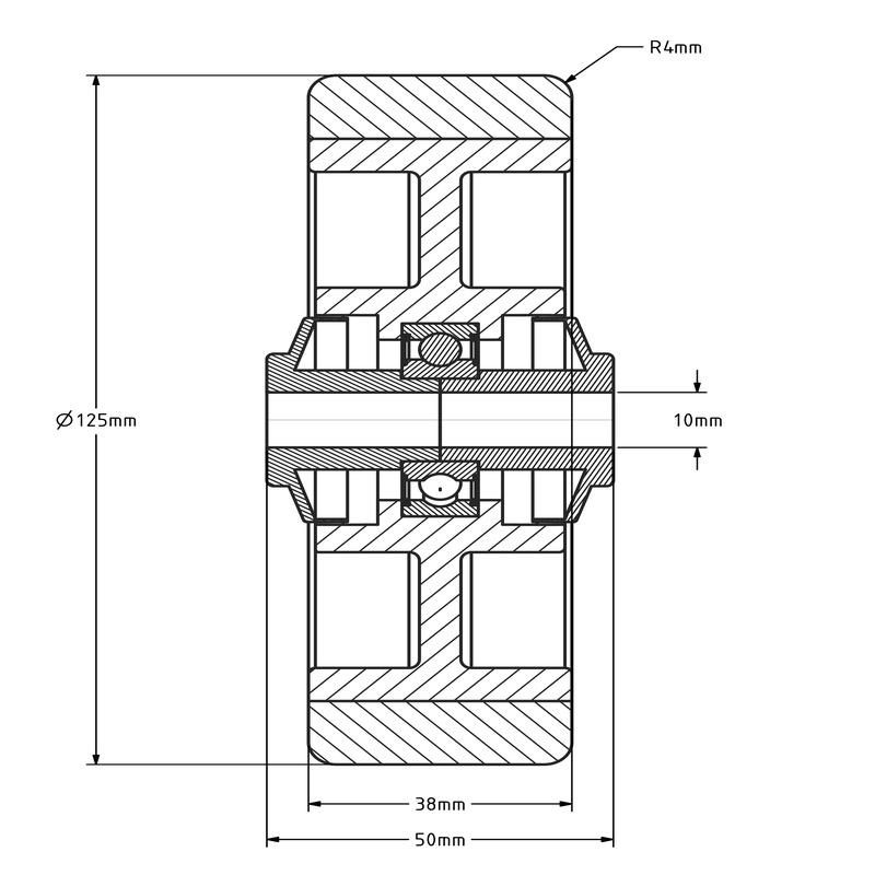 Gummirad 125 mm - Kugellagerbohrung 10 mm - 135 kg