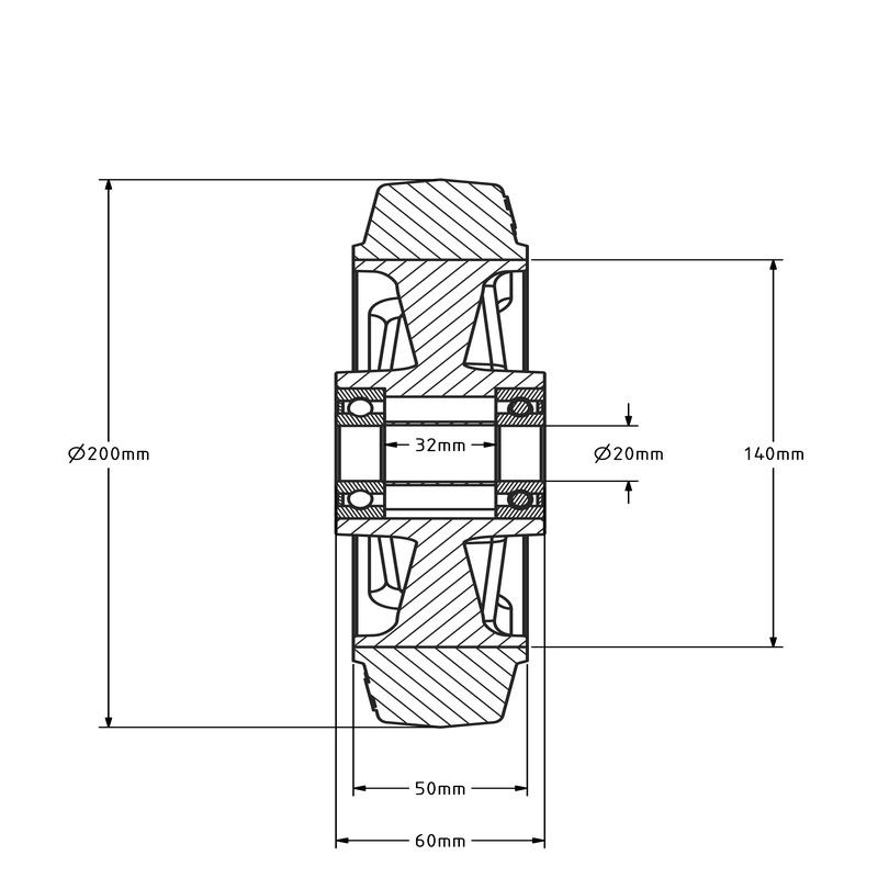 Gummirad 200 mm - Kugellagerbohrung 20 mm - 450 kg