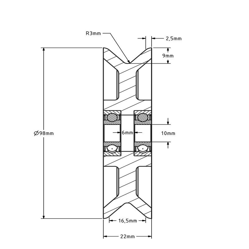 Kabelscheibe aus Polyamid (PA6) mit einem Kugellager 6000 ZZ.