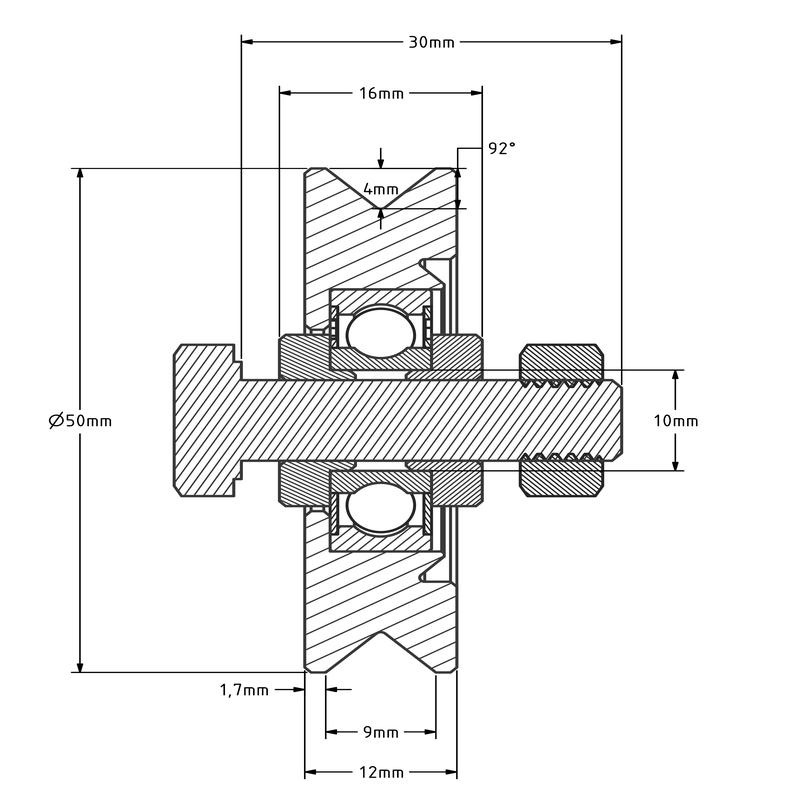 Die Laufrolle hat eine 92-Grad-V-Rille und eine Welle.