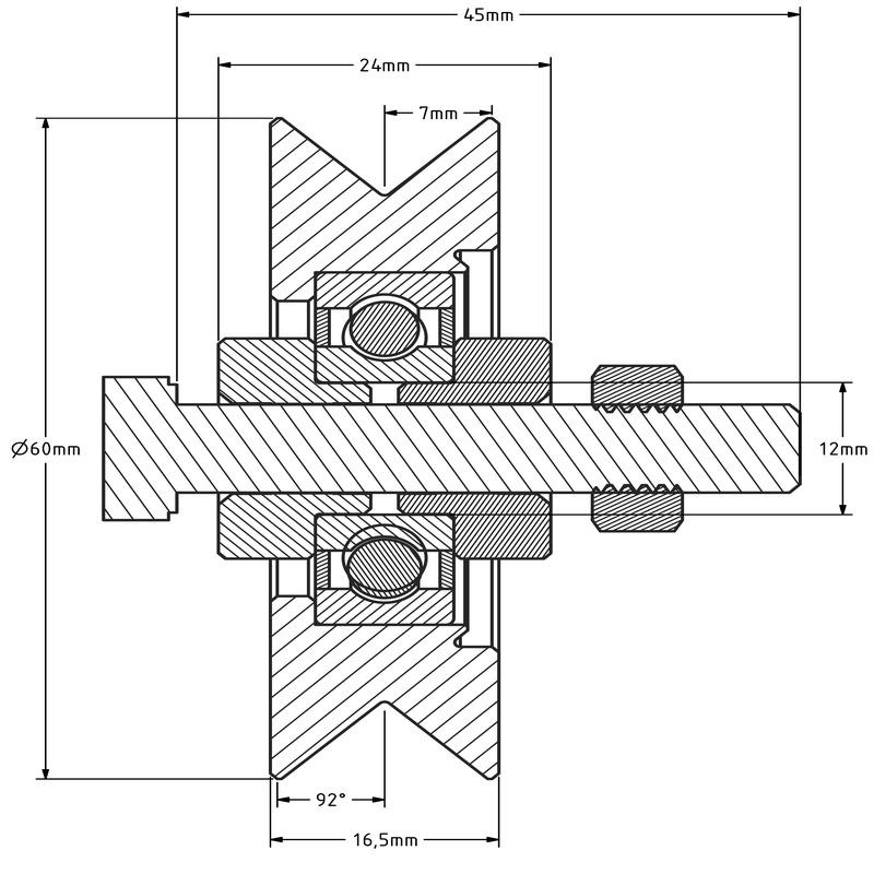 Die Laufrolle hat eine 92-Grad-V-Rille und eine Welle.