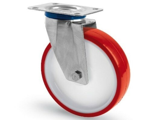 Edelstahl-Lenkrolle 160 mm PU mit Edelstahl-Rollenlager und Platte - 350 kg