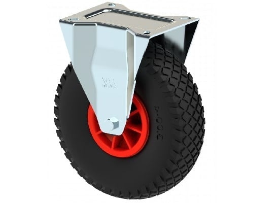 Räder mit schwarzem Luftreifen 300-4 (Blockprofil), gepresst auf roter Kunststofffelge mit Rollenlager.