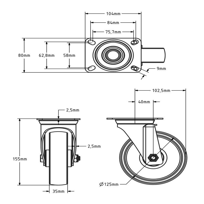 Lenkrolle 125 mm aus Nylon mit Rollenlager und Platte - 200 kg