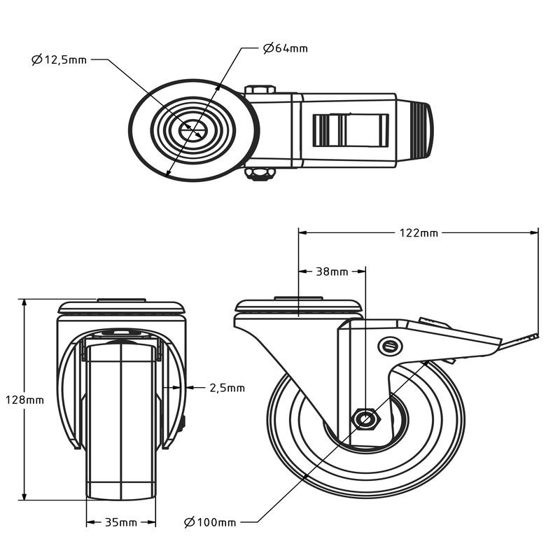 PU-Lenkrollen 100 mm mit Bremse und Bolzenlochbefestigung - 150 kg