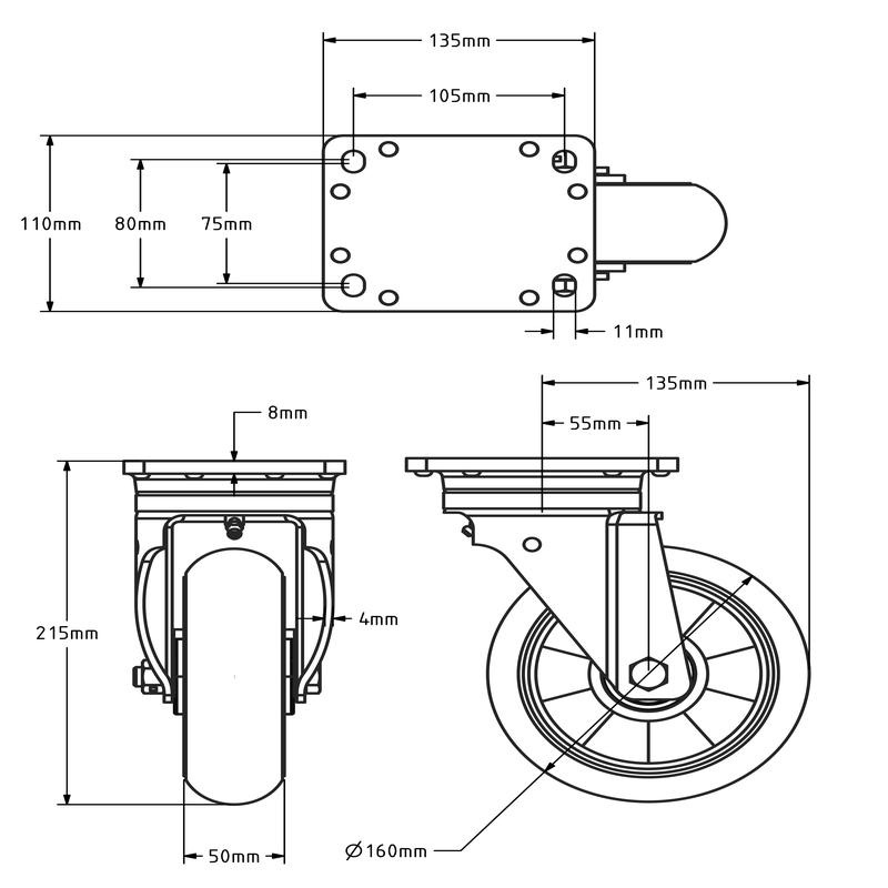 Die Polyurethan-Lauffläche ist bekannt für ihre Langlebigkeit, ihren geringen Rollwiderstand und ihre Laufruhe. Dieses Material ist auch für Industrieböden wie Beton, Epoxidharz und Fliesen geeignet und eignet sich gut für den Einsatz in Produktionsumgebungen, Logistikzentren, Werkstätten und auf Transportwagen.