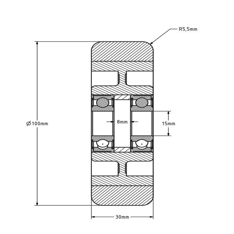 PU-Rad 100 mm mit Kugellagerbohrung 15 mm - 250 kg