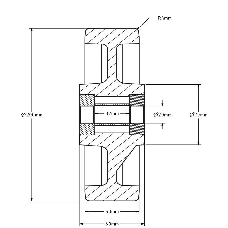 PU Rad 200 mm - Kugellagerbohrung 20 mm - 1000 kg