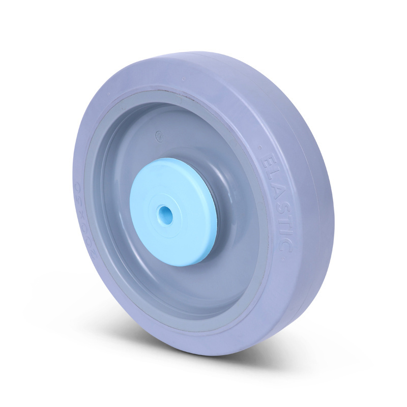 Räder mit einem grauen Elastik-Gummireifen (ca. 68 Shore A), der auf eine weiße Polyamid-Felge gespritzt ist, mit Kugellagern aus Edelstahl und Radkappen.