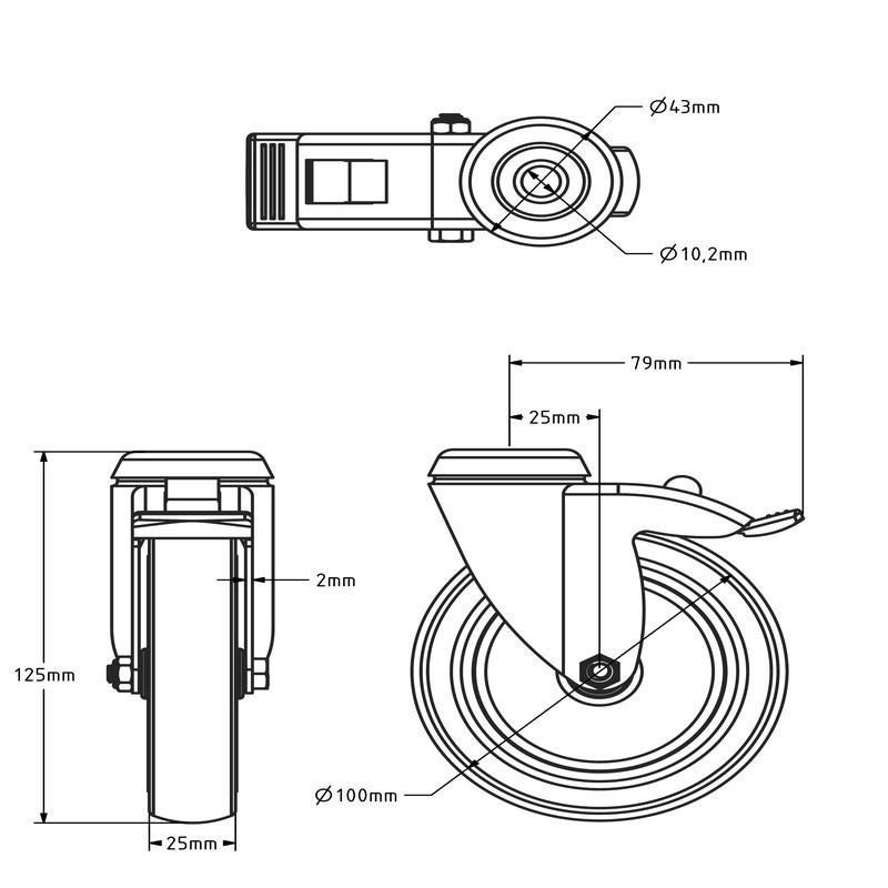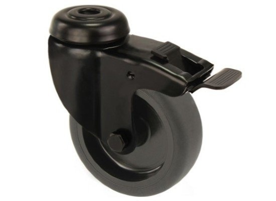 Schwarze Lenkrollen mit Bremse 100 mm - Bolzenloch - 80 kg