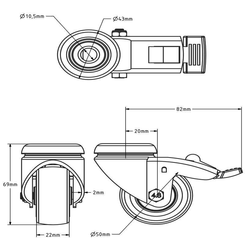 Diese schwarze Lenkrolle mit Bremse hat einen Raddurchmesser von 50 mm und eine Bauhöhe von nur 69 mm. Durch die geringe Bauhöhe ist dieses Rad ideal für Anwendungen mit begrenztem Einbauraum, wie z.B. Möbel, Messgeräte oder mobile Displays bis zu 50 kg. Die integrierte Bremse arretiert das Rad und die Drehfunktion in einer Bewegung.