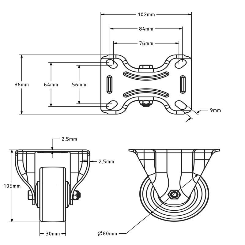 Bockrolle aus Gummi 80 mm mit Platte - 80 kg